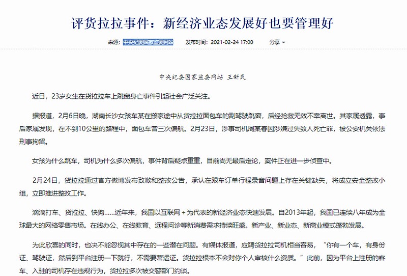中央纪委国家监委网站2月24日以《新经济业态发展好也要管理好》为题,评论了货拉拉事件。
