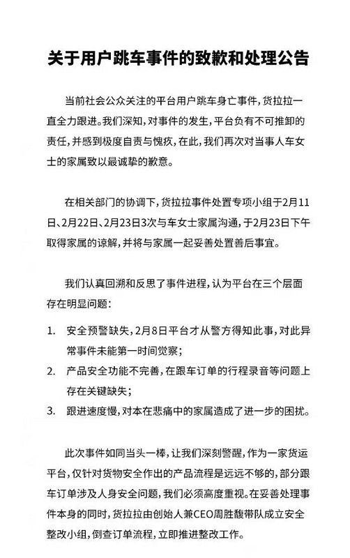 2月25日,交通运输部对近期货拉拉一女生跳车事件进行回应。交通运输部表示,无论是传统道路货运物流企业,还是依托互联网、信息化技术成长发展的新业态新模式,抑或是涉足到物流领域的电子商务平台,都应当牢牢坚守安全发展的底线,始终把维护和保障人民群众生命财产安全放在第一位,决不能打着创新的旗子,打着互联网的牌子,走以牺牲安全为代价的发展路子,必须处置好安全与发展、守正与创新的关系,依法依规,规范经营,切实落实好安全生产的主体责任,采取有效举措,持续提升安全管控能力和服务质量。