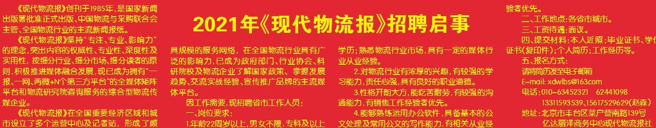 《现代物流报》创刊于1985年,是国家新闻出版署批准正式出版、中国物流与采购联合会主管、全国物流行业的主流新闻报纸。《现代物流报》坚持“专注、专业、影响力”的理念,突出内容的权威性、专业性、深度性及实用性,按细分行业、细分市场、细分读者的原则,积极推进媒体融合发展,现已成为拥有“一报、一网、两微+N个第三方平台”的全媒体矩阵平台和物流研究院咨询服务的综合型物流传媒企业。《现代物流报》在全国重要经济区域和城市设立了多个运营中心及记者站,形成了颇具规模的服务网络,在全国物流行业具有广泛的影响力,已成为政府部门、行业协会、科研院校及物流企业了解国家政策、掌握发展趋势、交流实战经验、宣传推广品牌的主流媒体平台。