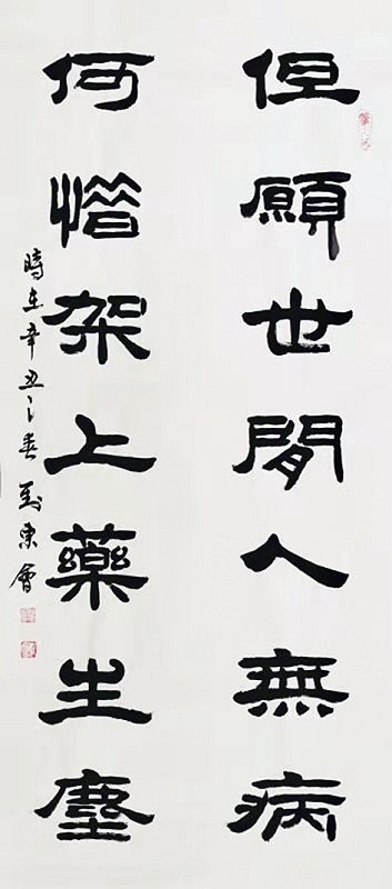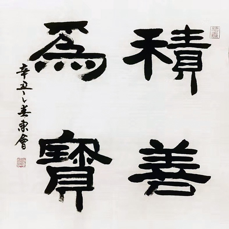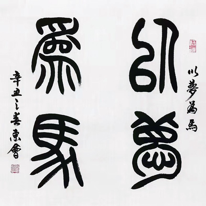 刘东会书法真草篆隶行皆有涉猎,尤其以篆、隶见长。其书风沉稳而灵动,古朴而俊雅,一笔一字都彰显扎实的功底。其隶书上追汉魏,下学明清,端庄秀丽而不失遒劲。他遍观历代名帖及名家手迹,融古汇今,博采众长。他用篆书的笔意写出隶书的形态,篆中有隶味,篆隶杂揉,尽显古典之美。他的小篆运笔流畅,提按自如,线条极富变化和文化内涵,其笔画清劲,圆转宛通,兼有秦篆古厚的笔势。
