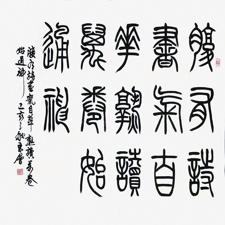 从楷书临帖,首选唐欧阳询,其用笔刚劲顿挫,方正中见险。既有传统规矩,又有意气风发,恰与少年心性相契。此后一鼓作气,遍临诸家。汉简朴拙,魏碑静穆,石鼓苍劲,篆书柔美飘逸,笔端融会贯通,灵活运用于日常,挥毫其上,风格独具,创意十足。
