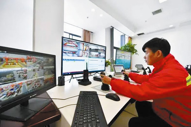 图为合肥港工作人员正在室内对场桥进行远程操控