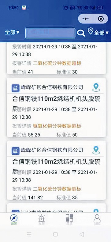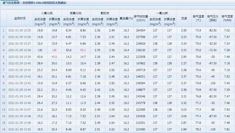 1月29日10点38分,邯郸市生态环境局峰峰矿区分局信息中心,“智慧环保”平台企业污染源自动监测设备动态管控系统突然报警,合信钢铁有限公司110m2烧结机机头脱硫后排口氮氧化物和二氧化硫分钟数据超标。平台监管人员王庆立即将问题发至合信钢铁企业,合信钢铁第三方运维人员和企业环保技术人员及时通过平台查看超标情况并现场整改,10点40分数据恢复正常。