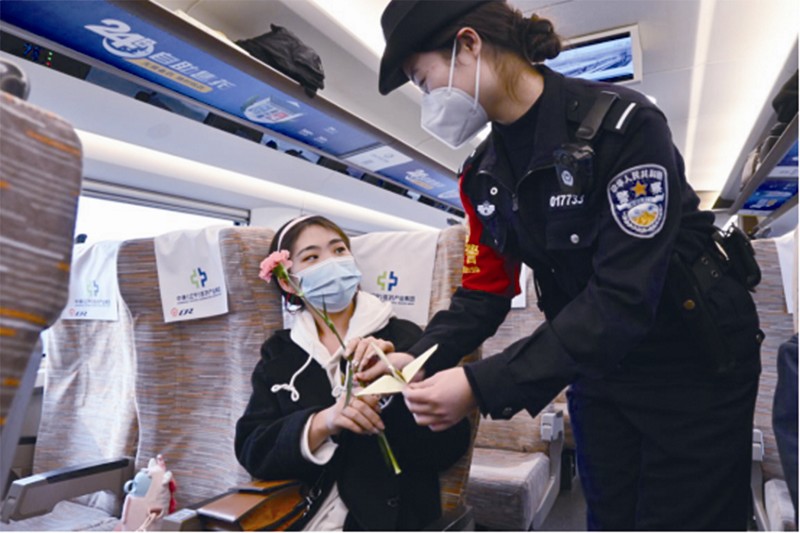 赵凌月,女,23岁,现为石家庄公安处乘警支队乘务三大队民警。2019年毕业于铁道警察学院,2020年4月加入石家庄乘警支队这个大家庭,今年是她的第一个“春运”,也是她首次执行全国两会安保任务。2020年12月18日晚上22点50分,她接到了支队指挥室电话称,由她值乘的G2811次列车上有一名网上在逃人员,接到电话后,她立刻带好装备,开起执法记录仪,赶往现场,并没有因自己是个柔弱的女孩子而退缩。她通知车长带领两名乘务员一同协助她将网上在逃人员制服,最终安全将其移交给前来接站民警。“愿要大,志要坚,气要柔,心要细”这是像李婵和赵凌月一样许许多多石家庄乘警支队女警的座右铭。当石家庄疫情突然来袭,她们始终坚守岗位,直至列车停运当天她们依然在岗位上坚持工作,不曾有一丝懈怠。当疫情缓解、列车复开,她们又重新投入工作岗位中,用实际行动诠释了新时代青年女警的誓言。