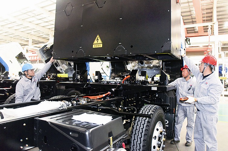 本报讯 (记者 胡智慧 摄影报道)近年来,汉马科技集团股份有限公司致力于科研创新。一季度,已向河南和浙江供应70辆换电混凝土搅拌车,以“充电安全、运营效率高、使用成本低、配置电量灵活”的优越性得到用户的青睐。 图为3月23日,员工们正在安装自主研发准备投放浙江市场的新能源混凝土搅拌车282度电池集成箱。