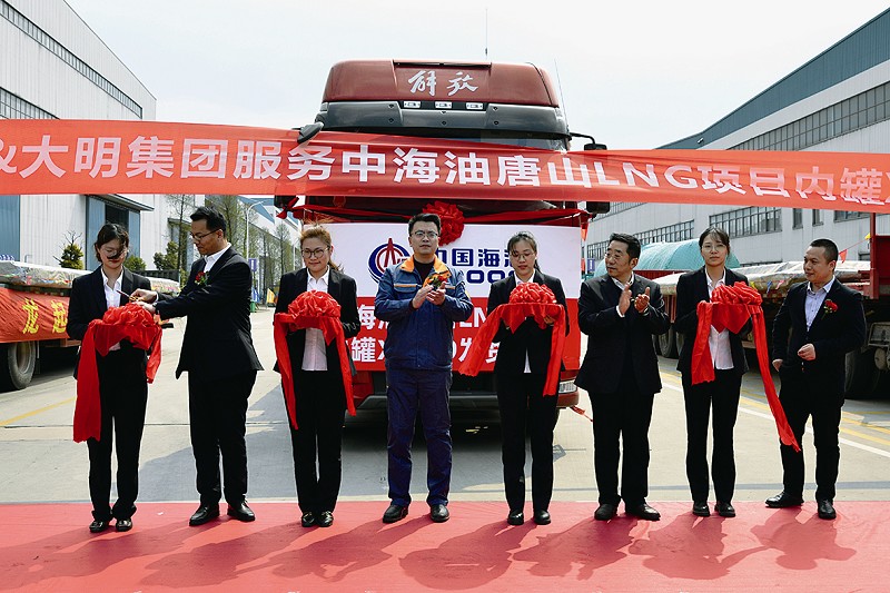 本报讯3月24日,今年首批宝钢股份有限公司9镍钢产品在大明金属科技有限公司顺利发货,将服务于中海油唐山的LNG项目。随着我国石化工业快速发展,素有“钢铁钻石”之称的液化天然气储罐用9镍钢获得了日益广泛的应用。此项目供货量将达到9000余吨,也是宝钢股份在9镍钢有史以来最大的订单。 图为宝钢股份与大明相关领导为9镍钢板发运仪式剪彩。(杨木军)