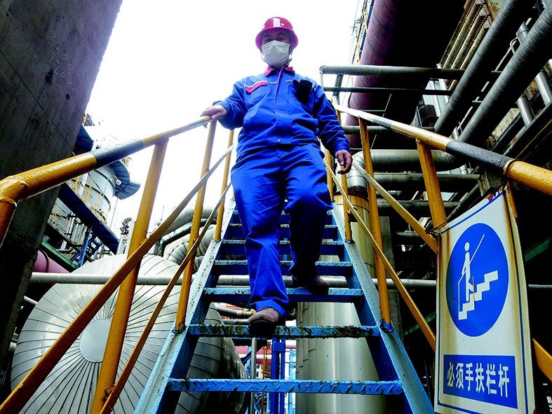本报讯 今年以来,安徽淮北矿业集团临涣焦化公司开展危险化学品安全生产标准化一级企业创建工作,严格按照12个A级要素、56个B级要素要求进行资料台账归档,并加强现场安全管理,员工严格执行生产工艺操作规程、安全生产操作规程等,创建工作有序开展。图为该公司员工在生产现场按规范要求手扶楼梯护栏巡检。 (魏玉东摄)