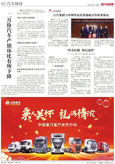 本报讯 3月22日,江汽集团与中国外运在外运大厦签署战略合作框架协议。根据协议,双方将在国内供应链服务(...
