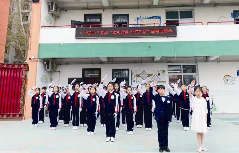 升旗仪式上,大队辅导员带领全体学生郑重宣誓:缅怀先烈,好好学习、缅怀先烈,奋发向上,缅怀先烈,振兴中华!
