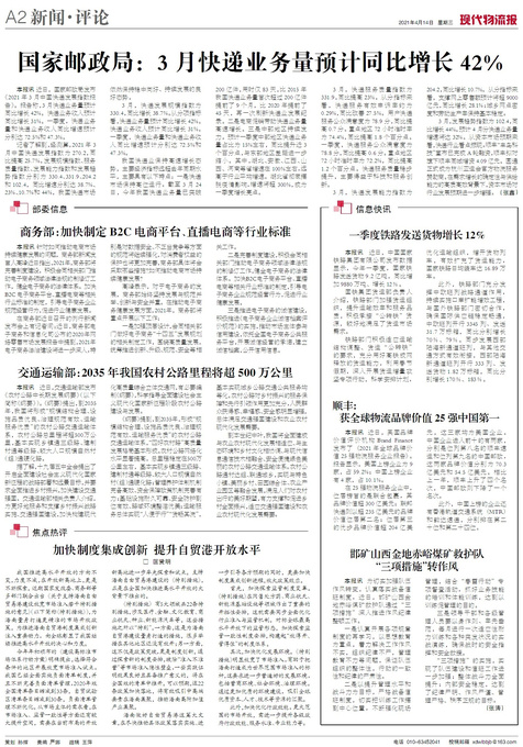 本报讯近日,国家邮政局发布《2021年3月中国快递发展指数报告》。报告称,3月快递业务量预计同比增长42%。...