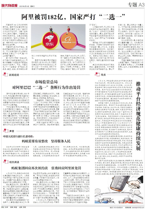 阿里被罚182亿元的新闻刷屏网络。国家市场监管总局依法对阿里巴巴集团“二选一”垄断行为作出的行政处罚,为...