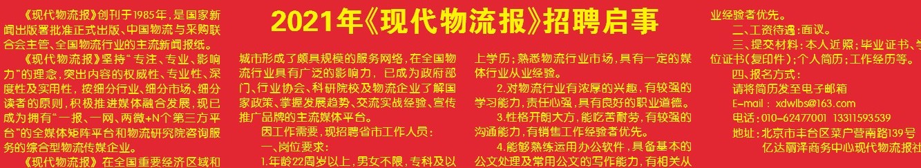 《现代物流报》创刊于1985年,是国家新闻出版署批准正式出版、中国物流与采购联合会主管、全国物流行业的主流新闻报纸。《现代物流报》坚持“专注、专业、影响力”的理念,突出内容的权威性、专业性、深度性及实用性,按细分行业、细分市场、细分读者的原则,积极推进媒体融合发展,现已成为拥有“一报、一网、两微+N个第三方平台”的全媒体矩阵平台和物流研究院咨询服务的综合型物流传媒企业。《现代物流报》在全国重要经济区域和城市形成了颇具规模的服务网络,在全国物流行业具有广泛的影响力,已成为政府部门、行业协会、科研院校及物流企业了解国家政策、掌握发展趋势、交流实战经验、宣传推广品牌的主流媒体平台。
