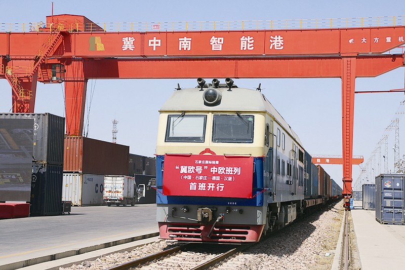 本报讯 (记者常河山 摄影报道)4月17日13时38分,河北省首趟直通德国的“冀欧号”中欧班列满载50车货物从位于高邑县的石家庄国际陆港鸣笛启动,奔向万里之遥的德国汉堡。“冀欧号”中欧班列(石家庄-汉堡)线路由石家庄国际陆港与俄罗斯MG集团合力打造,由100个标准集装箱组成,主要货物为机械配件、家具、服装、电子产品等,货重达497吨,货值近2000万元,经二连浩特口岸出境,途经蒙古、俄罗斯、白俄罗斯、波兰4国,行程11000多公里,预计历时18天到达德国汉堡。“欧盟是河北最主要的外贸市场之一。”常年从事中欧进出口业务的俄罗斯MG集团董事长王斌说,2020年河北对欧盟进出口额占全省进出口总值的近11%。石家庄国际陆港国际班列事业部经理李江娜表示,中欧班列速度快于海运、成本低于空运,已成为中欧间越来越有吸引力的货运方式。
