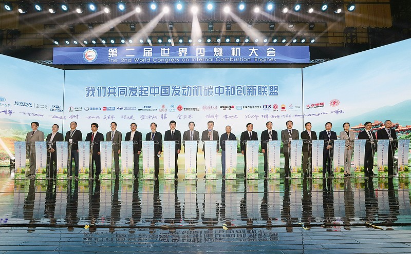 全国政协副主席、中国科学技术协会主席万钢通过视频祝贺。全国政协经济委员会副主任、工信部前部长苗圩发来贺信。大会共同主席、中国内燃机学会副理事长、内燃机可靠性国家重点实验室主任谭旭光主持开幕式。在本届大会上,中国内燃机学会联合中国汽车工程学会、中国船舶工业行业协会、中国船级社、潍柴集团等20家发动机产业链核心单位组成强强联合体,共同发起成立了“中国发动机碳中和创新联盟”。