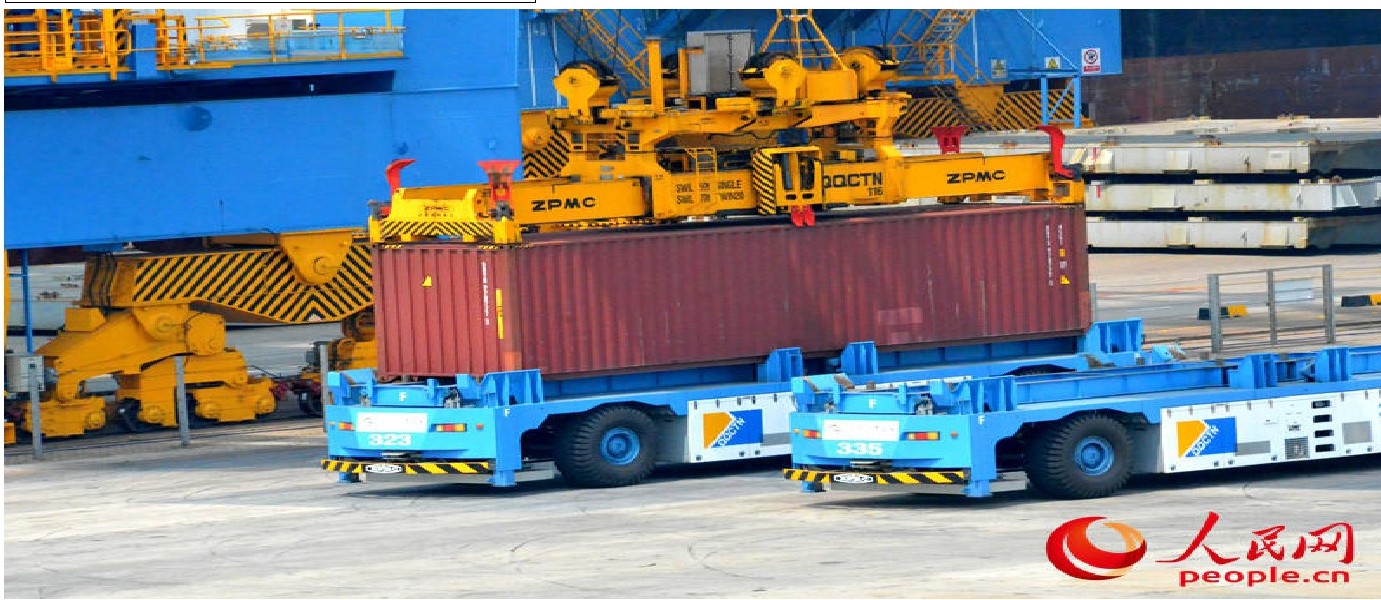 无人驾驶的自动导引装载车正在接收集装箱货物