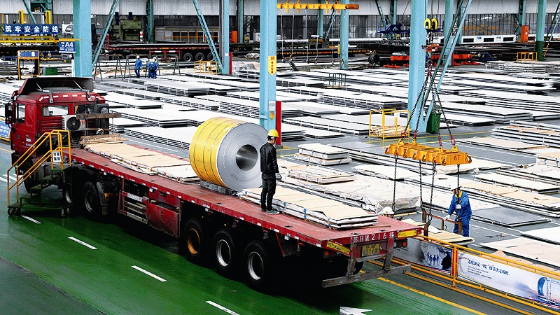 本报讯4月26日,江苏泰州市靖江工业园区,一家钢铁材料制造企业承接海外矿山开采项目制作一批配套设备,工人正加工和调运矿山设备所需的不锈钢材料。 国内外市场需求持续向好,碳中和及新基建等领域发展机遇带动了工业投资快速回升,为靖江市工业制造业加速度提供了充沛动能。 图为近日江苏靖江市工业园区,大明靖江加工基地的工人在调运矿山设备制造用途的不锈钢板材。 (杨木军)