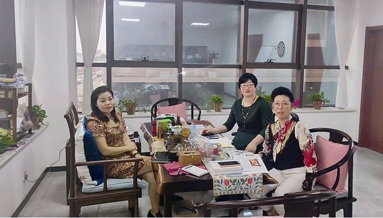 图 1 靳美美与郑州市钢贸商会常务副会长、河南恒威钢铁有限公司总经理赵彦丽(左)、郑州市红宇金属材料有限公司总经理陶风玲(右)