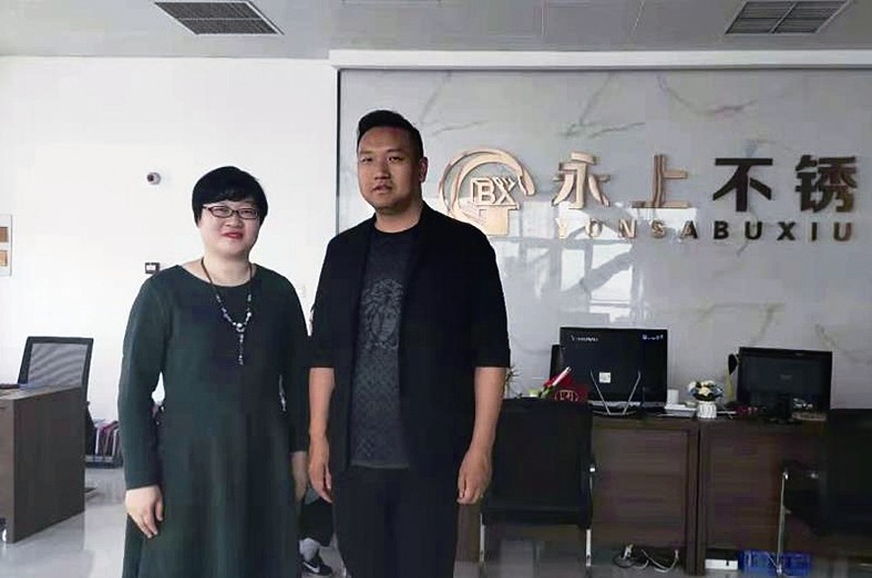 图2 美鸿财务总经理靳美美(左)与郑州市钢贸商会不锈钢分会会长、河南永上不锈钢总经理张宁彬