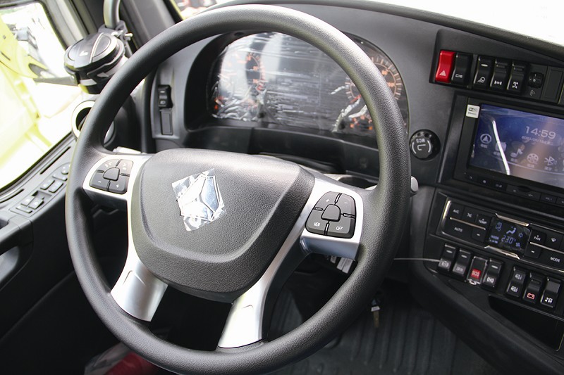 在安全性方面,作为国内最早生产智能卡车的汕德卡,2021版G系列牵引车配备有车道偏离预警、前方碰撞预警等安全智能系统,以及四方位影像装置,充分保证行车安全。