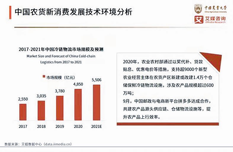 日前,中国农业大学智慧电商研究院和艾媒研究院联合发布《2021年中国农货新消费发展研究报告》,对中国农货消费变化进行量化分析。结果显示,中国农货正在进入规模化新消费阶段,2021年中国农产品网络零售额有望升至近8千亿元;2021年中国冷链物流市场规模有望达到5506亿元。报告指出,物流技术的发展特别是冷链物流应用是农货上行进入新阶段的重要影响因素。