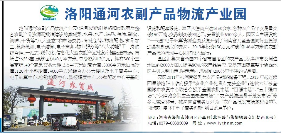 洛阳通河农副产品物流产业园(通河农贸城)是洛阳市政府为整合农副产品资源而批准建设的集蔬菜、水果、水产、冻品、粮油、副食、调味、干货等“八大业态”和市场交易、冷链仓储、物流配送、食品加工、检验检测、电子结算、电子商务、物业服务等“八大功能”于一身的综合性、一站式、现代化、信息化大型农副产品批发冷链配送市场。市场占地556亩,建筑面积40万平方米,总投资约12亿元。拥有560个三层商铺,40个蔬果交易大棚,3万平方米配套仓库,5000平方米恒温冷库,120个小型冷库,4000平方米综合办公大楼以及电子商务中心、电子结算中心、检验检测中心、监控调度中心、公益配送中心等基础设施和配套设施。园区入住商户达1650余家,各种农产品年交易量突破150万吨,交易额突破90亿元,安置就业6300余人。园区自主研发的“一卡通”电子结算货源追溯系统开创了河南省乃至全国同行业货源追溯机制建立的先河。2019年投资150万元扩建的146平方米的农副产品检验检测中心即将投入运行。