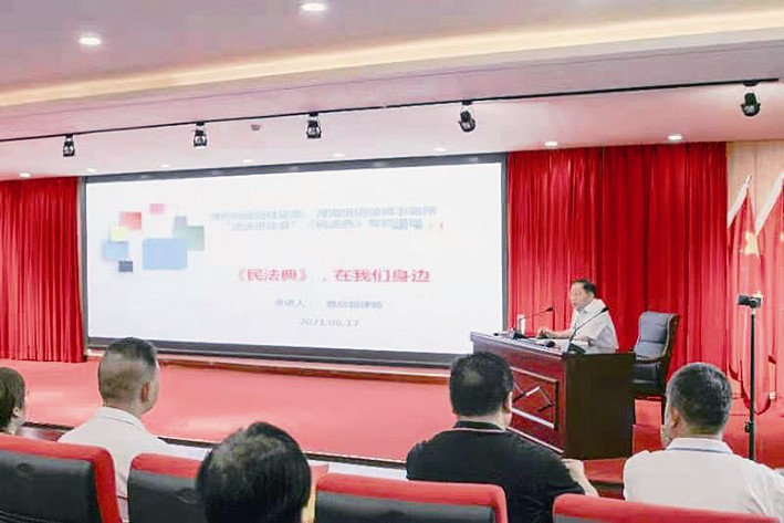 在活动开始,陈启超从《民法典》的编纂过程及重大意义、立法目的和制定依据、调整对象和根本任务、立法靓点概要等方面对民法典进行了介绍。通过引经据典、实际案例的方法重点对“总则”“物权”“合同”“人格权”“婚姻家庭”“继承”“侵权责任”等七编中的靓点,向大家进行了生动形象的说明。