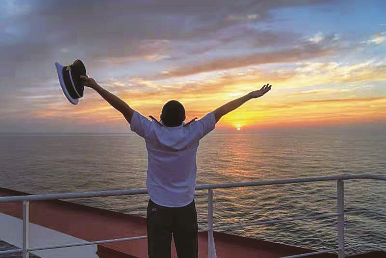 福建海运集团远洋散货船“金海发”轮大副陈江在航行途中观赏海上夕阳。 新华社记者才扬摄