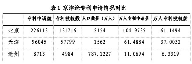 表1京津沧专利申请情况对比