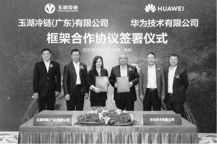 本报讯 记者从玉湖冷链(广东)有限公司了解到,日前,玉湖冷链与华为技术有限公司在深圳坂田华为总部签署框架合作协议,双方将充分发挥各自在跨国食品供应链和信息化技术方面的优势,就打造国际冷链食品智慧园区开展深度合作。玉湖冷链董事长陈少群,华为公司董事、企业BG总裁彭中阳等出席签约仪式,双方团队进行了座谈交流。