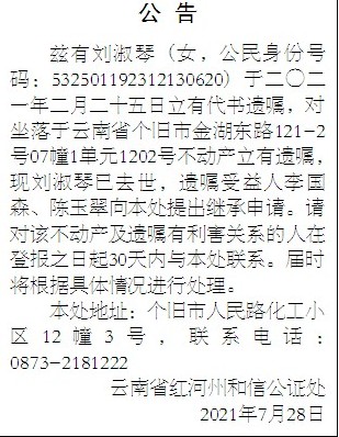 兹有刘淑琴(女,公民身份号码:532501192312130620)于二〇二一年二月二十五日立有代书遗嘱,对坐落于云南省个旧市金湖东路121-2号07幢1单元1202号不动产立有遗嘱,现刘淑琴已去世,遗嘱受益人李国森、陈玉翠向本处提出继承申请。请对该不动产及遗嘱有利害关系的人在登报之日起30天内与本处联系。届时将根据具体情况进行处理。