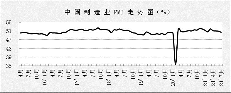 中国物流与采购联合会、国家统计局服务业调查中心发布的2021年7月份中国制造业采购经理指数(PMI)为50.4%,较6月下降0.5个百分点,但仍保持在50%以上,显示经济延续回升势头,增速有所放缓。分项指数显示,基础原材料行业供需增速放缓,消费品行业需求增速下行,带动制造业市场供需增速整体有所放缓,生产指数和新订单指数分别较6月下降0.9和0.6个百分点。市场价格又出现加快回升。7月指数回落,短期因素有一定影响,但经济整体平稳向好运行基础没有发生改变。