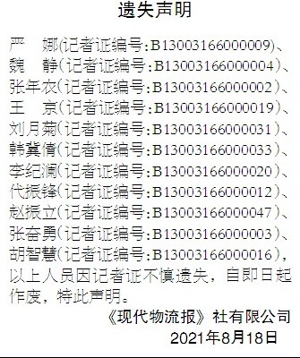 严 娜(记者证编号:B13003166000009)、魏 静(记者证编号:B13003166000004)、张年农(记者证编号:B13003166000002)、王 京(记者证编号:B13003166000019)、刘月菊(记者证编号:B13003166000031)、韩冀倩(记者证编号:B13003166000033)、李纪澜(记者证编号:B13003166000020)、代振锋(记者证编号:B13003166000012)、赵振立(记者证编号:B13003166000047)、张奋勇(记者证编号:B13003166000003)、胡智慧(记者证编号:B13003166000016),以上人员因记者证不慎遗失,自即日起作废,特此声明。《现代物流报》社有限公司2021年8月18日