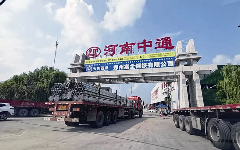 一辆货车刚刚驶出,又一辆满载镀锌管的洛阳牌照大货车正在扫码入园。百超加工的门前停着等待装货的车辆;河南雄迈通风设备公司的场地上,摆放着很多生产出来的通风产品,车间里依旧如常的响着加工设备的轰鸣声……这是记者在中通钢材市场采访时见到的场景。