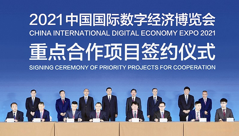 2021中国国际数字经济博览会采取线上线下同步互动、有机融合等方式。博览会期间,20余位两院院士、300位行业领军人物和权威专家学者齐聚一堂,深入探讨数字经济与实体经济融合发展的新趋势、新模式。