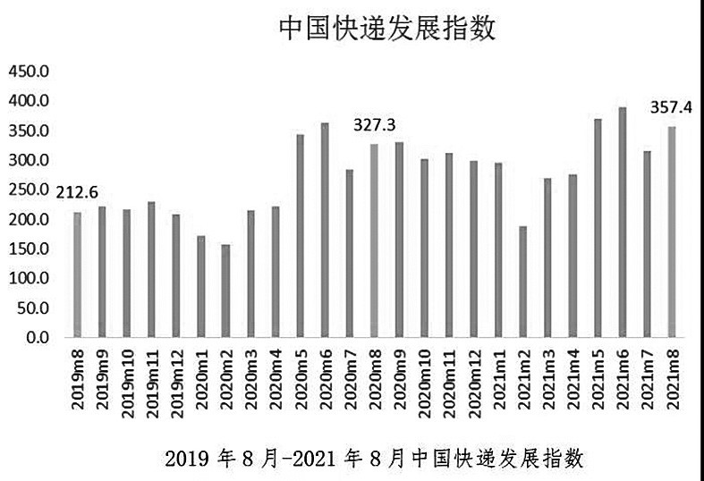 9月3日,国家邮政局发布2021年8月中国快递发展指数报告。经测算,2021年8月中国快递发展指数为357.4,同比提高9.2%。其中,发展规模指数为346.4,增幅达22.1%,持续保持中高速发展态势;服务质量指数与发展能力指数分别为630.8和189,同比增长7.7%和 1.1%;发展趋势指数为75.8。快递市场发展总体平稳。
