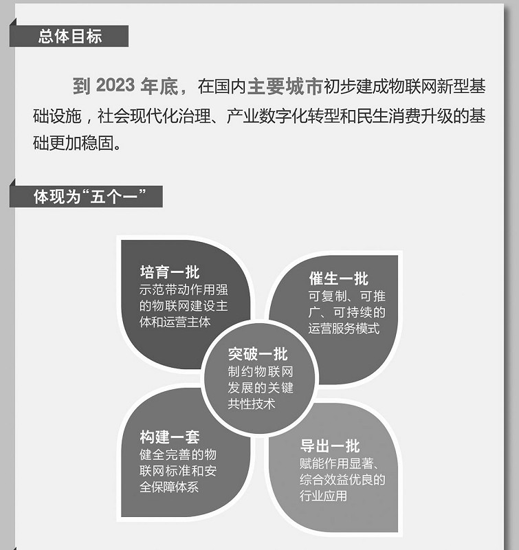 《行动计划》提出,到2023年底,在国内主要城市初步建成物联网新型基础设施,社会现代化治理、产业数字化转型和民生消费升级的基础更加稳固。具体发展目标体现为“五个一”,突破一批制约物联网发展的关键共性技术,培育一批示范带动作用强的物联网建设主体和运营主体,催生一批可复制、可推广、可持续的运营服务模式,导出一批赋能作用显著、综合效益优良的行业应用,构建一套健全完善的物联网标准和安全保障体系。此外,《行动计划》对物联网龙头企业培育数量、物联网连接数以及标准制修订数量提出了量化指标。