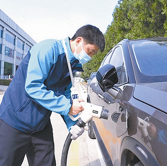 车行十几分钟,稳稳停靠在呼救车辆前方一米处。打开依维柯后门,一切豁然开朗,原来车上装载着两块满电的电池包,一头连着前舱的电箱控制器,一头盘着3米多长的输电管线。“别看这家伙有些笨重,充电效率比固定充电桩快多了!”说话间,杨志麻利地扯起输电线,插入充电口,不一会儿信号灯闪烁,眼前的车重新“复苏”了。“帮车主克服‘里程焦虑’,也是一种救援。”充电的间隙,杨志指着身边的移动充电车说,“订单在哪里,我们就跟去哪里。今年国庆,我沿着订单一路从承德向北,过塞罕坝,最后到了锡林郭勒,走了3000多公里。每天开着它给出游的车主们提供充电救援服务,最多的一次,十几个订单连轴转,一天一夜没合眼。”“强度这么大,累不累?”“苦中作乐嘛!到处走还能到处看哩,工作两年多,北京周边的景点没有我没去过的。”杨志哈哈一笑,转头又严肃起来,“你瞧,现在救援就一部手机、一个工具箱、一身工作服,可里边的学问多着呢。设备全部数字化,看不懂代码就上不了手,操作要求标准化,连上螺丝的扭矩都有精确要求,没两把‘刷子’还真上不了路。”“那怎么才能当好汽车救援员呢?”“一页页啃书,一点点琢磨呗,要向技能讨进步。”“叮——”电池刚满格,新订单又来了,踩一脚油门,杨志又上路了。