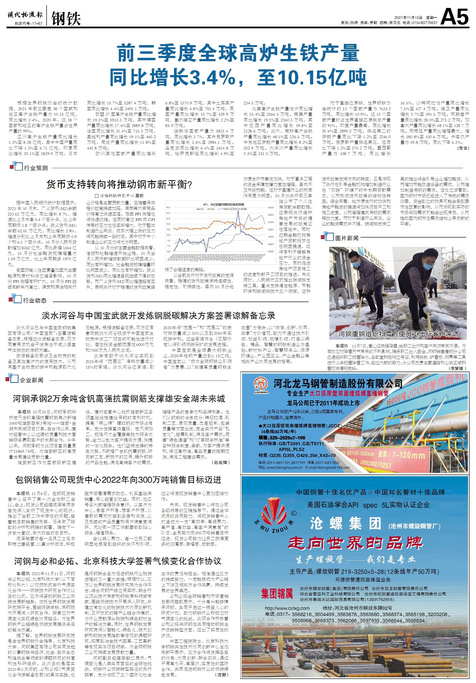 ■ 前三季度全球高炉生铁产量同比增长3.4%,至10.15亿吨