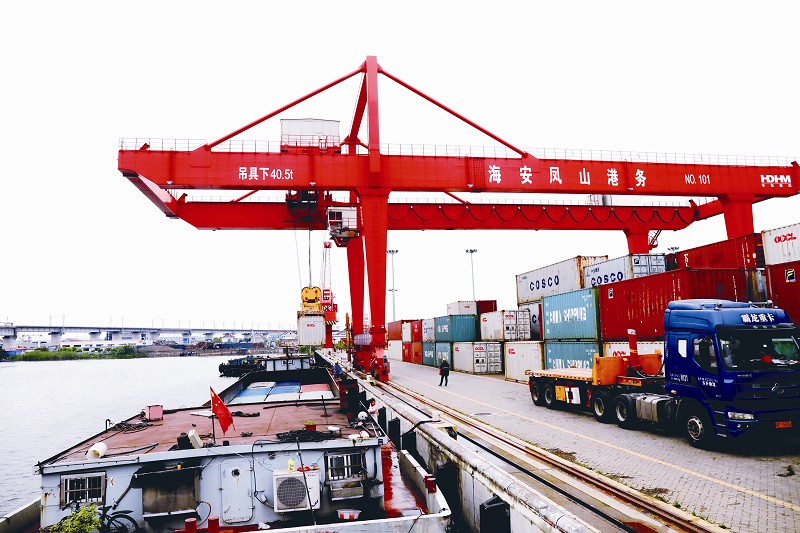 11月6日,海安商贸物流产业园区凤山港码头上,工人们正在装箱货物,这批印有“荣威运动用品”标签的外贸集装箱,10多天后将发往上海口岸,再运往美国。“我们把货物送到家门口的凤山港码头,就等同到了上海港,又便捷又节省物流成本。海安作为省级综合交通枢纽正在发挥着积极的作用,非常有希望建设成为国家物流枢纽城市。”海安荣威运动用品有限公司总经理王海清告诉记者。