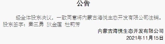经全体股东决议,一致同意将内蒙古海悦生态开发有限公司注销。股东签字:秦三勇 狄金莲 杜莉芳内蒙古海悦生态开发有限公司2021年11月15日