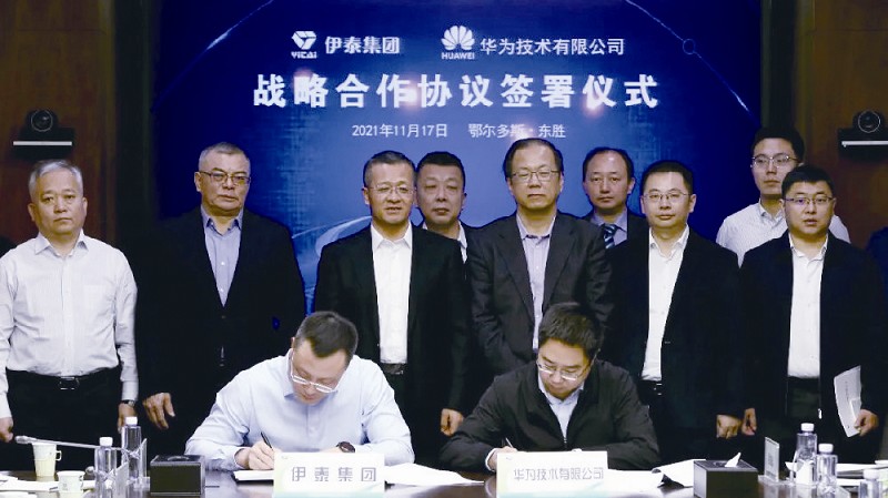 本报讯 11月17日,伊泰集团公司与华为技术有限公司就智能化矿山建设签署战略合作协议,华为公司高级副总裁、煤矿军团董事长邹志磊一行与伊泰集团公司副总裁葛耀勇,集团公司副总裁、总工程师赵立克,股份公司总经理刘剑,集团公司副总经济师王春迎出席签署仪式并召开座谈会。