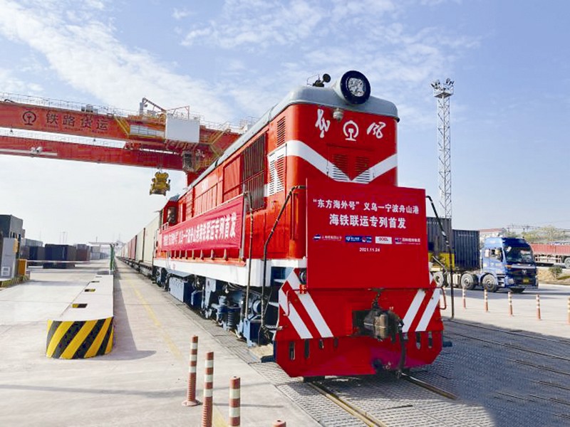 本报讯 11月24日,装载100个标箱日用小商品、太阳能光伏产品等出口货物的81946次海铁联运班列在铁路义乌西站鸣笛启程,驶向宁波舟山港,这标志着义乌—宁波舟山港海铁联运专列“东方海外号”首发。