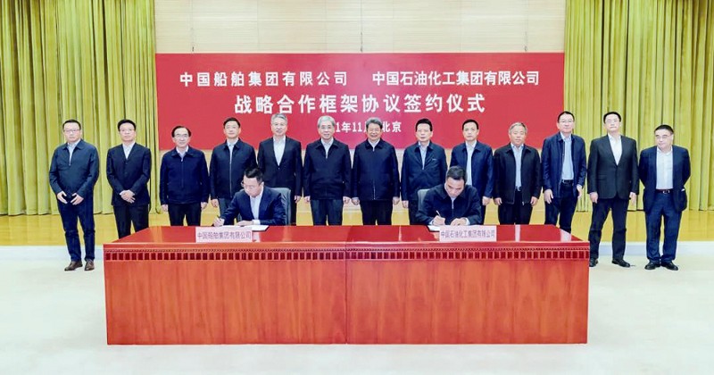 本报讯 11月29日,中国船舶集团有限公司与中国石油化工集团有限公司签署战略合作框架协议。中国船舶集团党组书记、董事长雷凡培,党组成员、副总经理盛纪纲,中国石油化工集团党组书记、董事长马永生,党组成员、副总经理凌逸群出席签约仪式。盛纪纲和凌逸群分别代表双方在协议上签字。