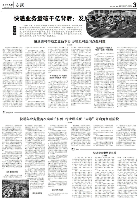 编者按 12月8日上午,国家邮政局快递大数据平台的实时监测数据显示,2021年我国快递业务量首次突破1000...