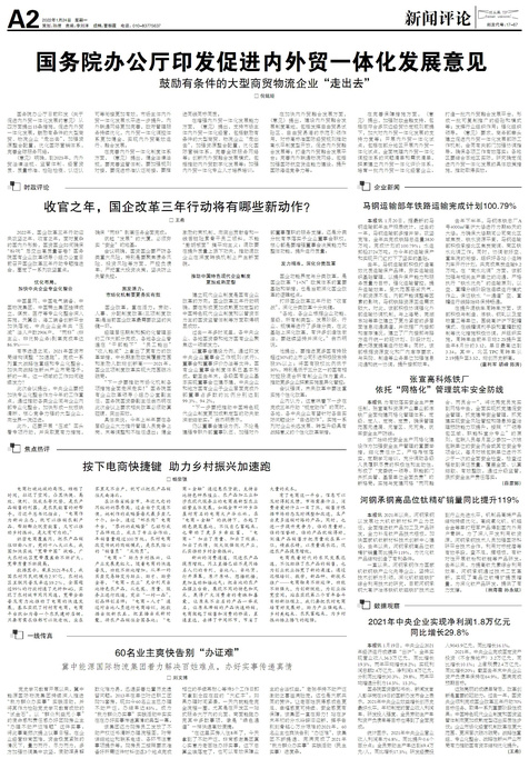 本报讯1月19日,中央企业2021年经济运行成绩单“出炉”:全年实现营业收入36.3万亿元,同比增长19.5%,两年平...