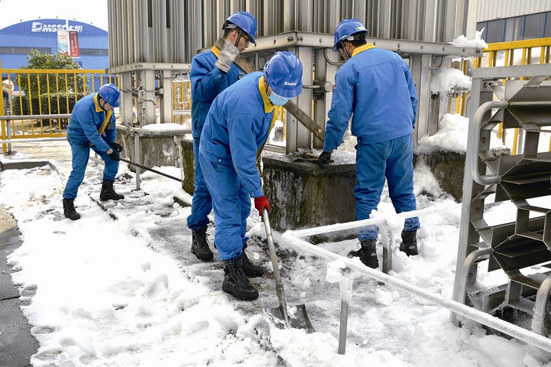 本报讯据统计,国内钢铁物流城市—无锡,2021年度机械工业实现工业总产值9383亿元,同比增长22.9%。其中,利润总额693.4亿元,同比增长7.3%;出口交货值1088亿元,同比增长29%;总产值占全市工业43%,增速高于全市工业1.9个百分点;日前,无锡市机械工业列江苏省机械行业龙头。图为2月10日江苏省无锡市锡山区的大明工业科技集团有限公司,员工为存放液氮设备铲除冰雪,保障生产,冲刺2月开门红。 (杨木军)