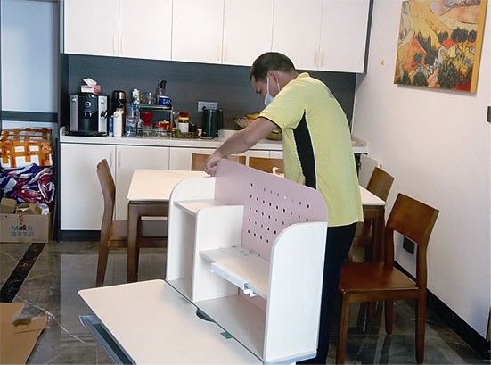 眼前堆积如山的100多件零件,光螺丝钉就有十几包,各种板材尺寸不一,苏劲玮淡定从容,零件归类后,按照图纸开始“指点江山”,经验丰富、擅长柜体组装的“老师傅”带着资历尚浅的队员,解决电视柜、衣柜等,专注马桶、浴室柜的服务工程师目标锁定卫生间,擅长橱柜、灶台的则主攻厨房部分,分工明确、一气呵成。