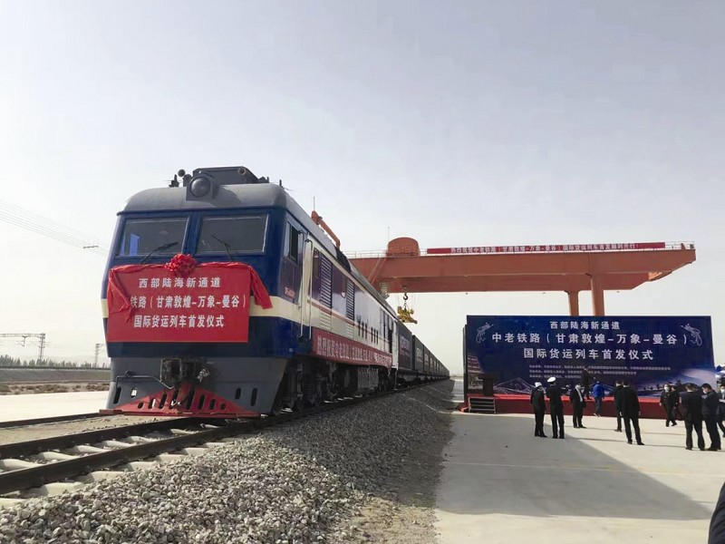 本报讯 (特约记者 陈斌摄影报道)4月21日上午11时30分,甘肃首趟陆海新通道中老铁路(敦煌-万象-曼谷)国际货运列车在敦煌西货场发运。