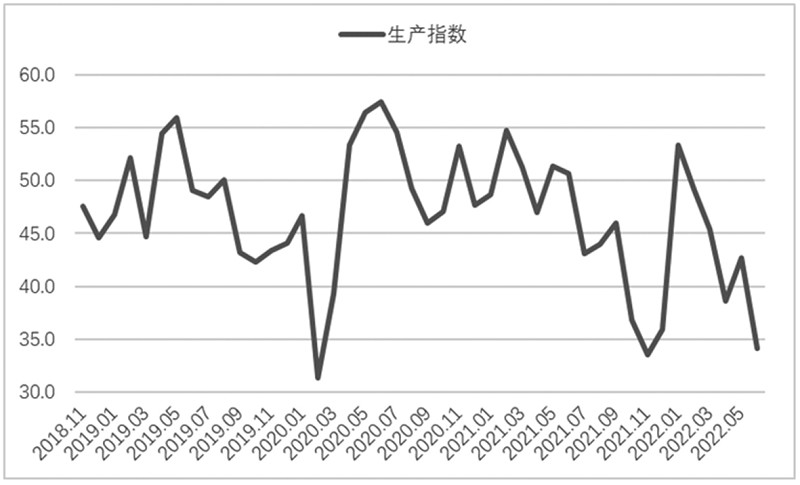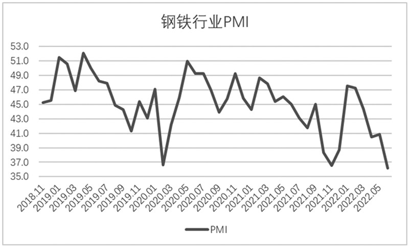 从中物联钢铁物流专业委员会调查、发布的钢铁行业PMI来看,2022年6月份为36.2%,环比下降4.6个百分点,钢铁行业运行较为低迷。从分项指数变化来看,疫情带来的影响仍有所持续,下游需求收缩,带动钢材价格整体下行,钢厂生产下降。预计7月份,市场需求整体继续偏弱运行,钢厂生产保持低位运行,钢材和原材料价格低位震荡。