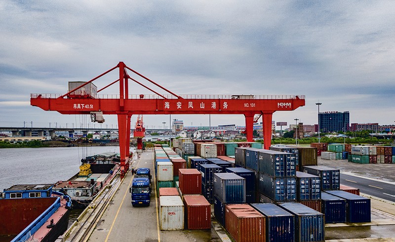 日前,海安商贸物流产业园区凤山港码头呈现一派繁忙景象,一批批外贸集装箱完成装箱,将择机发往上海口岸,再出口到国外。附近的宁启铁路,每天十几个班次从这里疾驰而过。凤山码头围绕打造华东地区江海大港重要喂给港、苏中苏北内河枢纽节点港的发展定位,对接上海港、洋山港、太仓港以及在建的通州湾等沿江沿海大港,引进干线船运公司和公铁水联运货代企业,结合本地产业特点和产品销售方向提供定制化的内河水运、江河、江海河联运转运方案。